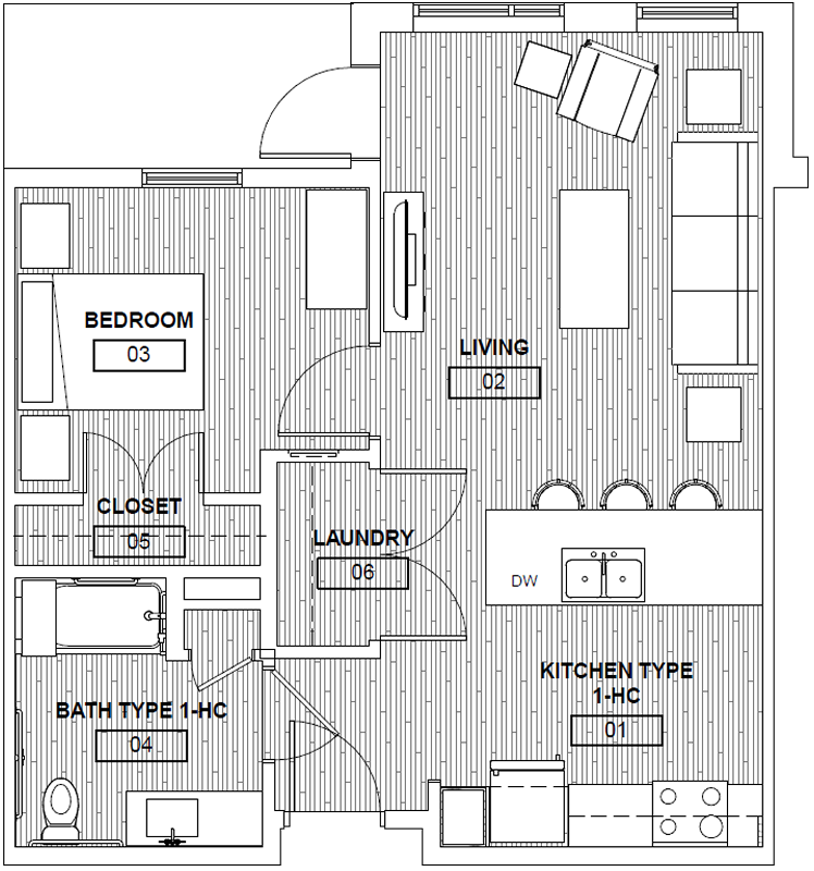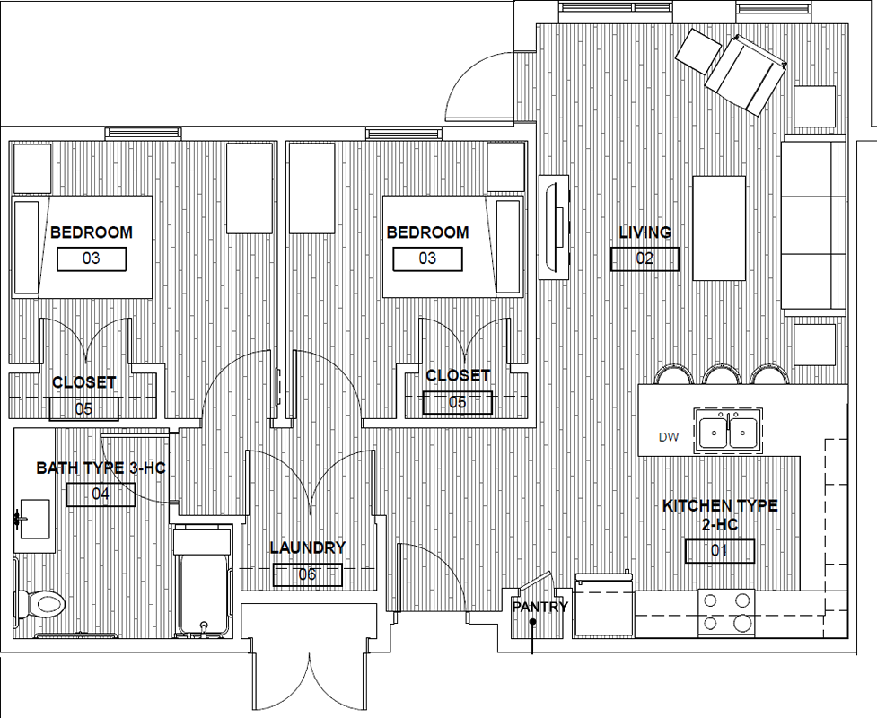 2A(a) - Two Bedroom / One Bath - HC- 913 Sq. Ft.*