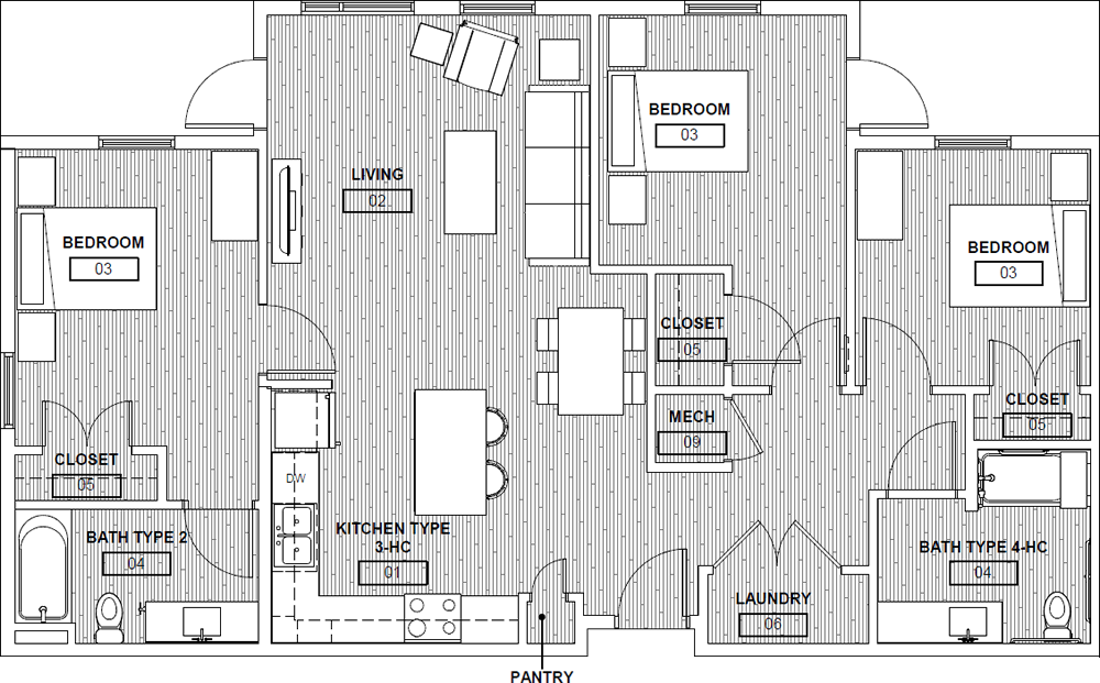3A(a) - Three Bedroom / Two Bath - HC- 1259 Sq. Ft.*