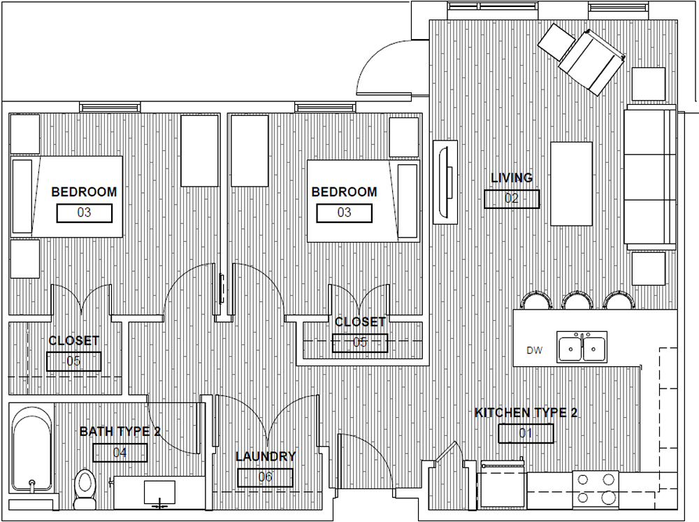 2A(a) Two Bedroom / One Bath - HC - 913 Sq. Ft.*